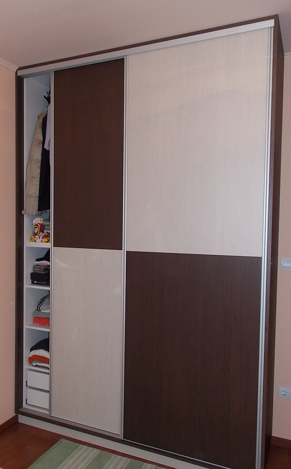 Beépített tolóajtós szekrény sakk mintájú frontokkal.