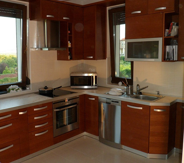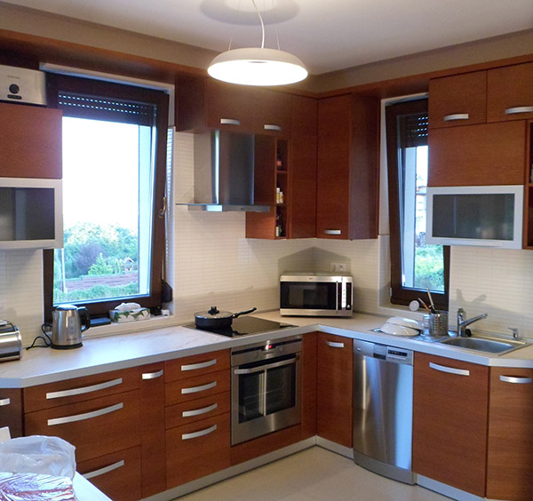 Modern konyhabutor tölgy furnér és alumínium anyagok felhasználásával.