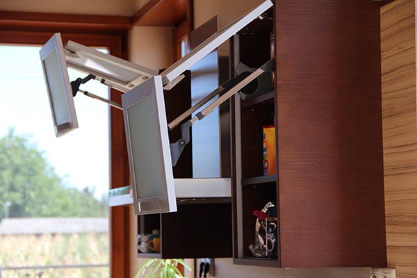 Dió és alumínium színű ajtófrontok coccobolo bútorlappal kombinálva.